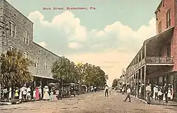 Railroad service was extended from Palmetto across the Manatee River to Bradenton in 1902.[26] Bradenton was incorporated on May 19, 1903,[3] with 59 voting in favor of incorporating and 34 voting against it.[27] Shortly after incorporation, a local election was held to choose the city's first elected municipal officials. A.T Cornwell was elected as mayor, Robert H. Roesch as clerk and tax assessor, A.B. Murphy as treasurer and F. Dryman as tax collector along with seven city council members.[28] One of the earliest moves made by the municipal government was amending the name to "Bradentown".[29][30][31] However the name change would not be reflected with the US Postal Service until 1905.[32] On December 29, a streetcar line began operation going from Bradenton to the neighboring city of Manatee and went west crossing Wares Creek to the nearby community of Fogartyville.[33][34] The company operating the line had financial difficulties, likely due to a lack of ridership, and cancelled the line in 1906.[35][36] The Manavista Hotel was opened in January 1907 bordering the Manatee River on Main Street.[37]