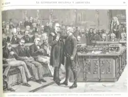 When it was known that this was the likely outcome of the Select Committee, Bradlaugh's fellow Northampton MP Henry Labouchère initiated a debate on a motion to allow Bradlaugh to affirm. Sir Hardinge Giffard moved an amendment that Bradlaugh be not permitted to take either the Oath or make an affirmation. After two days of debate,[24] Giffard's amendment was carried by 275 to 230, a defeat which surprised Gladstone. The majority comprised 210 Conservatives, 34 Liberals and 31 Irish Home Rulers; supporting Bradlaugh were 218 Liberals, 10 Home Rulers and 2 Conservatives.[25] On the next day, Bradlaugh came to the Table claiming to take the Oath; in consequence of the previous night's vote the Speaker ordered him to withdraw.