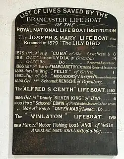 In 61 years, the Brancaster lifeboat had been launched 32 times, saving 34 lives and 5 vessels. Winlaton (ON 666) was sold locally, and was last reported as a yacht in 2005. No evidence remains of the boathouse. A storm in 1933 had destroyed the launchway, and undermined the boathouse, which was then demolished before the station closure. However, the station Service Board had been saved by lifeboat tractor driver Joe Powell. It was rediscovered by historian/author Michael Softley, and now hangs on display in the church of St Mary the Virgin in Brancaster.[9]