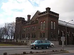 The stone and brick Brant County Courthouse was built on land purchased from the Six Nations in 1852. The structure housed courtrooms, county offices, a law library and a gaol. During additions in the 1880s, the Greek Revival style, with Doric columns, was retained.[27]