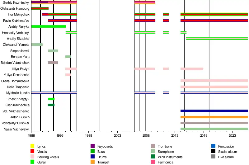 - Serhiy Kuzminskyi (Сергій «Кузя» Кузьмінський) — vocals, keyboards, lyrics, music (1987-1996, 2006-2009)