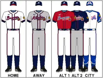 The Braves logos have evolved over the years, featuring a Native American warrior from 1945 to 1955, followed by a laughing Native American with a mohawk and a feather from 1956 to 1965.[107][108] The modern logo, introduced in 1987, includes the cursive word "Braves" with a tomahawk below it.[109] Uniforms adopted that year evoked their 1950s classic look.[110] For the 2023 season, the Braves had four uniform combinations, including the classic white home and gray road uniforms, a navy blue road jersey for alternate games, and two alternate uniforms for home games - a Friday night red uniform and a City Connect uniform worn on Saturdays, paying tribute to Hank Aaron.[111] The City Connect uniform features "The A" across the chest, accompanied by a cap with the "A" logo and 1974 uniform colors.[112]