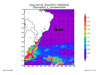 Current research is focusing in on trying to better observe the Brazil–Falkland Confluence Zone so the dynamics of this system can be better explained. Right now there only exists images of these small scale dynamical process (e.g. eddies), however, numerical interpretation of these eddies are still very much in the beginning stages of our understanding.[1] The other major area of research is focusing in on the biological productivity in this region. This confluence zone is such a "hot spot" for primary production because the Falkland Current supplies a lot of nutrients while the Brazil Current supplies warm ocean temperatures. Intense vertical mixing in these zones create a very fertile area for the production of biological species. This zone is looked at as a major atmospheric carbon sink due to the amount of primary production that takes place here which is vitally important in our changing climate.[9] Figure 5 shows chlorophyll-a concentration in this zone.