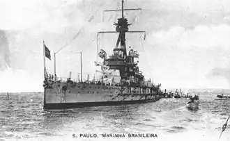 Crewmen aboard São Paulo rebelled on 4 November 1924, when First Lieutenant Hercolino Cascardo, seven second lieutenants and 260 others commandeered the ship.[50][51] After the boilers were fired, São Paulo's mutineers attempted to entice the crews of Minas Geraes and the other ships nearby to join.[3] They were only able to sway the crew of one old torpedo boat to the cause.[3] The battleship's crew, angry that Minas Geraes would not join them, fired a six-pounder at Minas Geraes that wounded a cook.[3][29] The mutineers then sailed out of Rio de Janeiro's harbor, where the forts at Santa Cruz and Copacabana engaged her, damaging São Paulo's fire control system and funnel. The forts stopped firing soon after the battleship returned fire due to concern over possible civilian casualties.[24] The crewmen aboard São Paulo attempted to join revolutionaries in Rio Grande do Sul, but when they found that the rebel forces had moved inland, they set course for Montevideo, Uruguay.[24][29] They arrived on 10 November, where the rebellious members of the crew disembarked and were granted asylum,[3][24] and Minas Geraes, which had been pursuing São Paulo, escorted the wayward ship home to Rio de Janeiro, arriving on the 21st.[29]