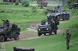 At the same time, the arguments against mechanization were deflated by the "vertiginous progress" of the Brazilian economy.[59] In the 60s and 70s, local automobile and war industries and the Army's research projects made it possible to nationalize most of the unarmored vehicles, modernize the American armored vehicles in use and manufacture armored vehicles on wheels: the EE-9 Cascavel and EE-11 Urutu from Engesa, respectively for reconnaissance and transport. National vehicles finally equipped the cavalry.[70] Likewise, infantry was also motorized and mechanized.[71] By 1973, mechanization had transformed most regiments,[72] reaching the last ones in Mato Grosso do Sul in 1985–1986.[b] Late mechanization was a Latin American trend; Mexico and Chile also had horse cavalry in the 1980s.[73]