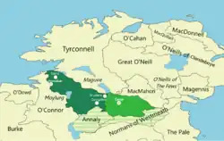 - ^ King Tadhg reigned from 1419 to 1424 as King of the western half of West Breifne (the area encompassing modern day County Leitrim west of Lough Allen) From 1424 to 1435, he ruled over the whole kingdom.