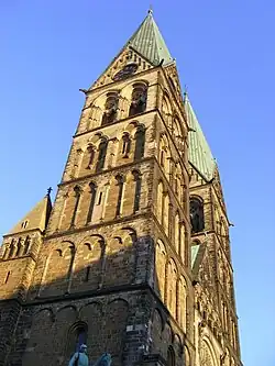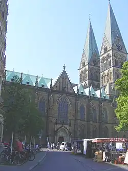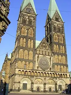 Bremen Cathedral (German: Bremer Dom or St. Petri Dom zu Bremen), named after St. Peter, is a church situated in the market square in the center of Bremen. The cathedral belongs to the Bremian Evangelical Church, a member of the umbrella organization Evangelical Church in Germany. It is the previous cathedral of the former Roman Catholic Prince-Archbishopric of Bremen. Since 1973, it is protected by the monument protection act.[1]