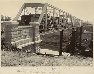 This bridge was constructed by Beatty and Walsh under the supervision of Government Engineer, F. L. Keir. The resident engineer was C. S. Graham. Messrs J. W. Sutton and Co. of Brisbane cast the cylinder piers and made the girders. The 1897 Bremer River Bridge and the Indooroopilly Bridge were the first to be riveted using a pneumatic machine.[1]