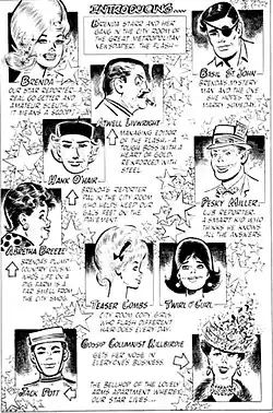 Brenda has always been a modern woman, noted for her exotic adventures and steamy romances.[10] Dale Messick and later artists concentrated on keeping Brenda contemporary in clothing and hairstyles. Comics historians Steve Duin and Mike Richardson stated that "Dale Messick kept readers enthralled for years over the romance between Brenda Starr and her Mystery Man".[11] Before Messick retired, Brenda finally married the mysterious Basil St. John, her "Mystery Man", whose eye patch and black orchid serum have been a regular plot element.[6] Shortly thereafter, Brenda had a baby girl named Starr Twinkle St. John.[12] Brenda and Basil divorced, and sparks flew when they met again. During one of Basil's reappearances, Brenda discovered Basil had a son named Sage with the talk show host Wanda Fonda. That marriage also ended in divorce. Brenda and Wanda became good friends. Eventually, Brenda was promoted from reporter to editor.[13] Brenda was the daughter of actress Beth Bennet (or Bennett[14]) and her husband Jack Starr. Her mother died under mysterious circumstances and Brenda's grief-stricken father sent her to boarding school.[15]
