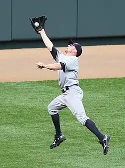 Gardner began the 2010 season as the Yankees' starting left fielder, taking over after Johnny Damon left in free agency, he finished the season with a .277 batting average and 47 stolen bases in 150 games, and had the highest number of pitches per plate appearance in the major leagues (4.61).[19] He also won the 2010 Fielding Bible Award as the best defensive left fielder in MLB.[15][20]