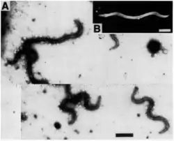 Brevinema andersonii (Brev. i. ne' ma. L. adj. brevis, short; Gr. n. nema, thread; N.L. neut. n. Brevinema, a short thread.) (an.derso'ni.i. N.L. gen. n. andersonii, of Anderson), named for John F. Anderson, who first described the organism.[1] This organism is a Gram-negative, microaerophilic, helical shaped, chemoorganotrophic organism from the genus Brevinema.[2] Brevinema andersonii is host associated, strains have been isolated from blood and other tissues of short-tailed shrews (Blarina brevicauda) and white-footed mice (Peromyscus Zeucopus) and are infectious for laboratory mice and Syrian hamsters.[1][2]B. andersonii is readily identified by restriction enzyme analysis, and SDS-PAGE, or fatty acid composition data. Another identifier for B. andersonii is the sheathed periplasmic flagella in the 1-2-1 configuration. While cells are visible by dark-field or phase-contrast microscopy, they cannot be seen when bright-field microscopy is used.[1]