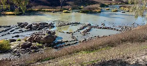 The Brewarrina Aboriginal Fish Traps, also known as Baiame's Ngunnhu, consists of a series of dry-stone weirs and ponds arranged in the form of a stone net across the Barwon River in north west NSW. They occupy the entire length of a 400m-long rock bar that extends from bank to bank across the river bed. Here, the river is fast-flowing and shallow, descending 3.35m over a set of four low rapids[36][1]