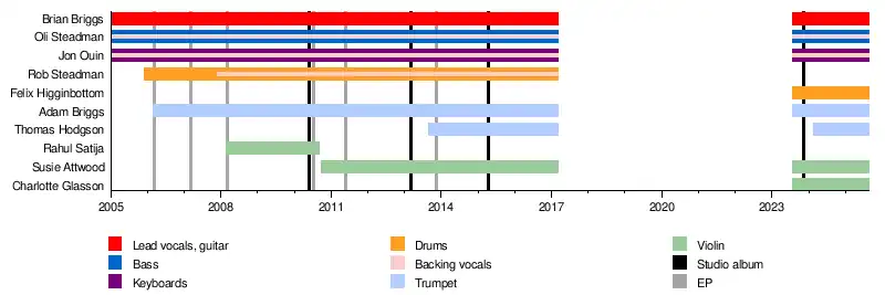 The band announced a forthcoming appearance at the Royal Albert Hall for 30th March 2026.[89] In July en route home from Gooikoorts festival in Belgium,[90][91][92][93] a Eurostar service malfunctioned[94][95] leaving hundreds of passengers stranded[96][97] and prompting the band to improvise a live performance[98] for travellers' entertainment.[99]
