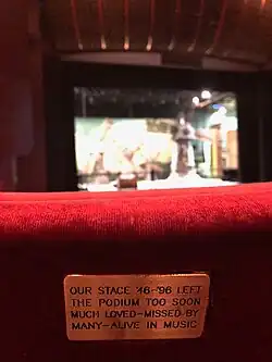 Stacey's ashes are spread on the banks of the Yarra River, Melbourne, Victoria. Seat S10 in the State Theatre, Arts Centre Melbourne, was dedicated to Brian's memory in 2008.[9] A tribute film[10] was made to celebrate his life and to mark the winding up of the Brian Stacey Memorial Trust in 2016. The film includes interviews with Sir Charles Mackerras, Guy Noble, Suzanne Johnston, Hugh Jackman, Marina Prior, Rhonda Burchmore, Sue Natrass and other Australian musicians.