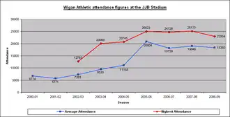 Rising success on the pitch has been met with increased attendances. Promotion into the Premier League meant that in their first season of English top-flight football, Wigan Athletic's average home attendance almost doubled from the season before. Over three times more fans attended matches at the stadium during Wigan's 2007–08 season in the Premier League than had attended in the 2001–02 season when Wigan Athletic were in the Football League Second Division. Wigan Athletic's average home attendance for 2007–08 was the lowest out of all 20 teams in the Premier League, failing to make the top 30 English clubs in terms of attendance.[45] The same season saw the highest ever attendance at the stadium, when 25,133 people witnessed Wigan play Manchester United on the final day of the season.[27]