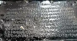 Before the birth of a prince in June 1738 in Thimi, there are no other mentions of any children from Briddhi Lakshmi. The copper plate inscription she set up at the temple of Bramhani in Bhaktapur two years later after the birth of her son in 1738, mentions his name as "Vira Narasimha Malla".[14] Vira Narasimha Malla is also the name that appears in a stone inscription from 1752 (NS 873), where it states that he was co-ruling the kingdom with his father.[21] However, Briddhi Lakshmi's poems from 1740–42, mention her son's name as Dhana sāheba ("Prince Dhana")[18] while her Banepa inscription mention her son's name as Devendra Malla.[21] Similarly, Devendra Malla's name also appears as a donor of a drum to Taleju, the tutelary goddess of the Mallas, in 1754.[22]: 79 Historian Dhaubhadel, citing her Brahmani copper plate inscription, presumes that all three names, Vira Narasimha, Devendra and Dhana refer to the same person.[14]