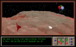 While the majority of inputs in Bride of the Robot are inputted through text commands, objects and characters may be interacted with using the mouse in the style of a point-and-click adventure.[4] The player may move in the cardinal directions using the arrow keys, and certain UI elements may be accessed through shortcut keys.[4] 'I' may be inputted to access the inventory, 'L' for information on current location, and 'S' for game status; the Big Thruster's computer AI Sandie gives advice pertinent to the player's location and situation.[4]