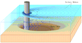 Bridge scour is the removal of sediment such as sand and gravel from around bridge abutments or piers. Hydrodynamic scour, caused by fast flowing water, can carve out scour holes, compromising the integrity of a structure.[1]