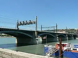 A first bridge, the Serin bridge or Halincourt bridge[4] (as in 1789) is built by Degerando between 1745 and 1749, on behalf of Hospices Civils de Lyon, owner of the work. The bridge collapsed in 1780 and was replaced by a wooden bridge, composed of seven arches, in turn carried away by a flood of the Saône on 17 January 1789. It was replaced by a new wooden bridge just over nine meters wide consisting of five arches, built from 1811 under the direction of the engineer Kermengan and inaugurated on July 2, 1815. In 1844, the wooden hangers, old, were replaced by stone arches. Very little damaged by the Germans, it quickly reopened after the war.