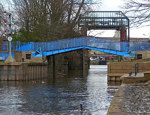 In the early 1730s a section of the eastern river bank of the Ouse was improved, at the expense of the city, to create an area lined with trees along which the citizens could promenade. It proved so popular that within a few years this New Walk was extended further south past the junction with the Foss by way of a wooden drawbridge.[46][47] This new bridge was painted blue and the colour and name have endured though the bridge itself has been replaced several times,[48] the first of these being in 1768 when a single-arch stone bridge was constructed.[49] In 1792 the Foss Navigation Company built a wooden swing-bridge to enable boats to access the Foss and this type of bridge was used again when the bridge was rebuilt in 1834.[48] In 1857–58 an iron opening-bridge was built along with two stone plinths upon which stood two Russian cannons. These had been captured at the Battle of Sebastopol in 1855 and became the Crimean War Memorial in York and as such were retained when the current bridge was built in 1929–30 only to be removed in 1941 when they were scrapped and melted down for the war effort.[39] In 2020, the bridge was to be temporarily removed for refurbishments, with a scaffold bridge taking its place.[50]