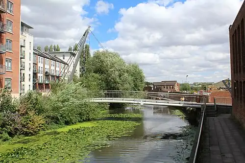 Opened in September 2011,[37] Hungate bridge is a cable-stayed cycle and foot bridge that links Navigation Road and Palmer Street. It has an 85 feet (26 m)[41] span with a single supporting mast on the north bank.[42]