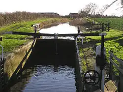 The canal was to be about 12 miles (19 km) long. It included a 700-yard (640 m) embankment at Lyng, which was 40 feet (12 m) high, two short cuttings, eleven brick-built bridges to carry roads over the canal, and more than twelve timber swing bridges, built to provide accommodation crossings for farms which had been divided by the line of the canal. The lock at Firepool (Taunton) had a set of reverse-facing gates, to prevent the canal draining if the level of the River Tone dropped. There were four more locks on the main line, and a lock at the entrance to Huntworth Basin. One final lock connected the basin to the river, and again it had a set of reverse-facing gates, so that the basin could be drained at low tide, and the low level retained for maintenance if required.[5] A system of paddle gearing – using metal ball weights at the top and metal cylinder weights at the bottom – is unique to the Bridgwater and Taunton Canal.[6] Over fifty culverts were built to carry streams and drainage ditches under the canal. The work was completed with no recorded incidents of serious injury or death among the workforce.[5]