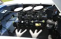 All 406 Zagato models are powered by Bristol's inline six-cylinder gasoline engine. The 2.2-litre (2,216 cc; 135.2 cu in) version used here, with a bore × stroke of 68.69 mm × 99.64 mm (2.70 in × 3.92 in), is a further development of the engine already installed in the 400, which goes back to the 1938 BMW M328 design.[30][31] While the Bristol engine shares its key features with the BMW engine, Bristol's version is designed in inches rather than metric dimensions, and some materials are used differently.[32] The engine has hemispherical combustion chambers, with two inclined overhead valves per cylinder. The intake valves are operated by a camshaft in the cylinder block via tappets, pushrods, and shaft-mounted rocker arms. Another set of pushrods goes across the cylinder head to a second rocker shaft to operate the exhaust valves.[32][33] The fuel mixture is delivered by three 32 PBI/7 Solex downdraft carburetors.[27]
