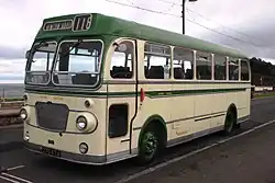 The single-decker ECW body was just 7 feet 6 inches (2.29 m) wide and used some similar styling elements to those built for the heavier Bristol MW. The bus bodies were 9 feet 5 inches (2.87 m) high but the coaches were a little taller at 9 feet 10 inches (3.00 m); the length varied depending on the chassis and whether it was the bus or coach style (see table below).[1] A forward entrance was provided opposite the driver's position. Seats were forward-facing in pairs, but where wheel arches protruded above the floor of the bus body, the seats were turned sideways to give sufficient leg room.[2]