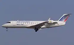 Brit Air Flight 5672 was a domestic passenger flight from Nantes Atlantique Airport to Brest-Guipavas Airport, France, which crashed on 22 June 2003. The flight was a Bombardier CRJ100ER operated by Brit Air, a regional airline which was a subsidiary of Air France. The aircraft crashed during its landing phase, striking multiple obstacles and then crashing onto a road and bursting into flames.[1] The occupants were evacuated immediately. The captain was killed in the crash, while 23 survived.[2][3][4][5]