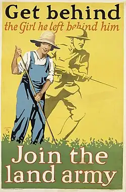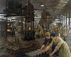 Newspapers played an important role in maintaining popular support for the war.[6] Large quantities of propaganda were produced by the government under the guidance of such journalists as Charles Masterman and newspaper owners such as Lord Beaverbrook. By adapting to the changing demographics of the workforce (or the "dilution of labour", as it was termed), war-related industries grew rapidly, and production increased, as concessions were quickly made to trade unions.[7] In that regard, the war is also credited by some with drawing women into mainstream employment for the first time.[8] Debates continue about the impact the war had on women's emancipation, given that a large number of women were granted the vote for the first time in 1918. The experience of individual women during the war varied; much depended on locality, age, marital status and occupation.[9][10]