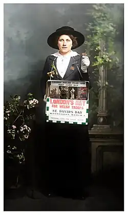 The Prince of Wales – the future Edward VIII – was keen to participate in the war but the government refused to allow it, citing the immense harm that would occur if the heir to the throne were captured.[53] Despite this, Edward witnessed trench warfare at first hand and attempted to visit the front line as often as he could, for which he was awarded the Military Cross in 1916. His role in the war, although limited, led to his great popularity among veterans of the conflict.[54][55]