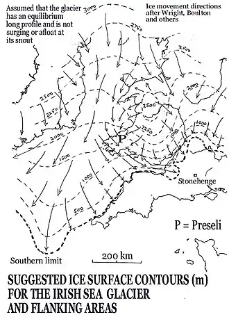 Currently there is a great debate about the dating of the Devensian glaciation of the Isles of Scilly. The ice of the Irish Sea Glacier certainly pressed against the northern coasts of the islands, and accumulating evidence seems to show that this occurred some time after 24,000 years ago.[4] During this same glacial episode the ice of the Irish Sea Glacier also swept along the southern Irish coast as far west as Cork, and reached its outer limit about 100 km to the SW of the Isles of Scilly. Research suggests that the ice was grounded everywhere and not floating; this is consistent with the view that sea-level at the LGM was around 120m lower than it is today. Even further out in the southwest approaches, the ice edge was floating and calving. One current theory is that the glacier moved to its outermost position by a "lobate surge partially propagated by high porewater pressures within deformable marine substrate",[5] leaving parts of South Wales, the Bristol Channel and the coasts of SW England free of glacier ice.