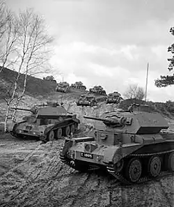 The November 1943 organisation removed a number of anti-aircraft tanks from each regiment and added a reconnaissance troop to the regiment bringing its strength to 55 cruisers, 6 close support tanks, 11 light cruisers and 6 anti-aircraft tanks. Each regiment would be manned by 37 officers and 655 other ranks.[55] By June 1944, the sabre squadrons in North West Europe were operating four-tank troops. All Sherman equipped units, including the 7th Armoured Division's sabre squadrons but excluding the Armoured Reconnaissance Regiments, were equipped with Sherman Fireflys; 36 were generally provided to each brigade, enough to equip each troop with one. Later in the campaign, as more Fireflys became available, the troops were issued with two.[56] The final change to the brigade and regiment was authorised on 18 January 1945, but was not implemented till May; it was to standardise all armour and tank brigades and regiments. No changes were made to the layout of the regiments; however, three tanks were removed from the brigade headquarters, two anti-aircraft tanks would be added and eight Observation Post tanks would also be allocated to the brigade.[55]