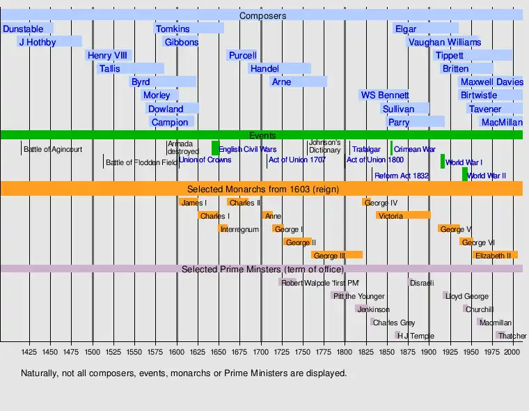 The Baroque era in music, between the early music of the Medieval and Renaissance periods and the development of fully fledged and formalised orchestral classical music in the second half of the eighteenth century, was characterised by more elaborate musical ornamentation, changes in musical notation, new instrumental playing techniques and the rise of new genres such as opera. Although the term Baroque is conventionally used for European music from about 1600, its full effects were not felt in Britain until after 1660, delayed by native trends and developments in music, religious and cultural differences from many European countries and the disruption to court music caused by the Wars of the Three Kingdoms and Interregnum.[14] Under the restored Stuart monarchy the court became once again a centre of musical patronage, but royal interest in music tended to be less significant as the seventeenth century progressed, to be revived again under the House of Hanover.[15]