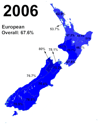 The 2006 Census counted 2,609,592 European New Zealanders. Most census reports do not separate European New Zealanders from the broader European ethnic category, which was the largest broad ethnic category in the 2006 Census. Europeans comprised 67.6 percent of respondents in 2006 compared with 80.1 percent in the 2001 census.[28]