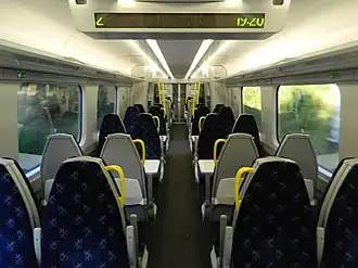 The Class 385 is a member of Hitachi's A-Train[2] family of aluminium trains and was the first order for the AT-200 commuter train model.[10][19] The trains are designed for a maximum speed of 100 mph (160 km/h). Sets are formed of two powered driving cars and one or two unpowered intermediate cars.[3] The trains are fitted with a Hitachi-designed IGBT traction pack. Four-carriage trainsets feature four powered bogies per set and the three-carriage trainsets have three powered bogies per set. The passenger doors are plug type and are located at 1/3 and 2/3s along the car body. Seating is in a 2+2 configuration with a mixture of four-seat table bays and airline seating with seat back tables. A toilet is fitted in each driving car. The trains are fully air conditioned.[2]