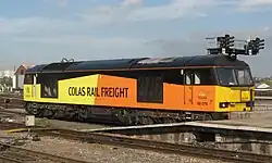 In June 2014, it was reported that 10 locomotives had been sold to Colas Rail. The numbers are 60 002/021/026/047/056/076/085/087/095/096.[31] The first one to appear in the Colas yellow and orange livery was 60 087, which was photographed at Burton-on-Trent on 2 June 2014.[32] In July 2018, Colas Rail sold all 10 of its locomotives to GB Railfreight.[33]
