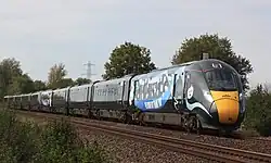 The British Rail Class 802[13][14] is a type of high-speed bi-mode multiple-unit passenger train designed and produced by the Japanese manufacturer Hitachi Rail. It has been operated by Great Western Railway, TransPennine Express, and Hull Trains; each of these train operating companies has given its own units a unique brand: Great Western Railway's units are branded Intercity Express Trains (IETs),[15] TransPennine Express units are branded Nova 1s[4] and Hull Trains' units are branded Paragons.[16]