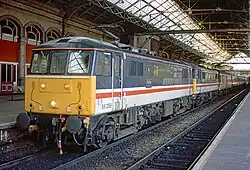 Further electrification of the Great Eastern Main Line in the 1980s beyond Colchester to Harwich,[nb 1] Ipswich and Norwich saw the class employed on passenger trains from London Liverpool Street to these locations; Ipswich was energised in 1985 and Norwich in 1987. Class 86s would operate inter-city passenger services to Norwich and boat trains to Harwich until 2005, when they were replaced fully by Class 90s. In addition, many of the freightliner trains to Felixstowe were also hauled as far as Ipswich by Class 86 locomotives working in multiple.[12] The West Anglia Main Line from Liverpool Street to Cambridge was also electrified at the same time and Class 86s hauled services on this route from 1987 until 1989.[15][16]