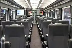 The interior of a refurbished ScotRail Mark 3 Standard Class with electronic destination displays