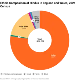 In the 2021 census for England and Wales, 77.2% of Hindus identified as Indian, 0.7% as either Pakistani or Bangladeshi, 15.6% were of other Asian heritage, 1.1% were of Mixed heritage, 0.7% as White, 0.2% identified as Black and the remaining 4.5% identified with other ethnic groups.[73] The main places of birth were in South Asia at 528,096 (51.1% of the total Hindu population), the United Kingdom at 360,772 people (34.9%), South and Eastern Africa at 106,361 (10.3%), other parts of Europe at 14,300 (1.4%) and East and Southeast Asia at 9,767 (0.9%). Among individual countries outside of the UK, the countries of: India, Sri Lanka, Kenya, Nepal, Uganda, Mauritius and Tanzania made up the most common countries of birth for Hindus residing in England and Wales.[74]
