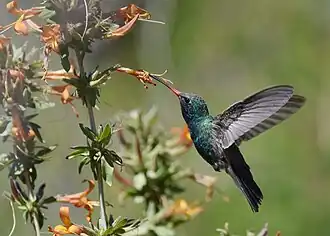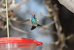 The broad-billed hummingbird (Cynanthus latirostris) is a small-sized hummingbird that resides in Mexico and the southwestern United States.[3] Males and females have different features (see sexual dimorphism). The juveniles resemble the female adult more than the male adult. The broad-billed hummingbird is a bright coloured bird with a broad and bright red bill. The bird is also known for its other common names – the Colibrí Pico Ancho in Spanish and Colibri circé in French.[4] It is more active during the day and less active during the night (see diurnality).[4]