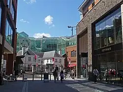 When the old shopping district of Castle Street and Wine Street was heavily damaged in the Bristol Blitz, it was decided to redevelop the Broadmead area as the main shopping district of the city.[4] Rebuilding began in 1950. The existing street, which ran between Union Street and Merchant Street, was extended north to include the former Rosemary Street.[5] Like most 1950s buildings in Britain, affordable and architecturally uninteresting utilitarian buildings form the bulk of the Broadmead area. In the 1980s some of these were removed to make way for the Galleries shopping centre, which is a three level covered street. Broadmead and several of the surrounding streets were pedestrianised.