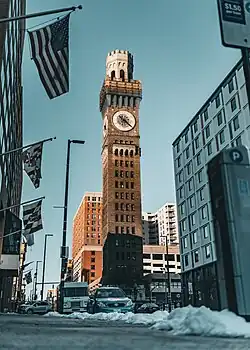 The Emerson Tower (often called the Bromo-Seltzer Tower or the Bromo Tower) is a 15-story, 88 m (289 ft) clock tower erected in 1907–1911 at 21 South Eutaw Street, at the northeast corner of Eutaw and West Lombard Streets in downtown Baltimore, Maryland. It was the tallest building in the city from 1911 to 1923, until supplanted by the Citizens National Bank building (later First National Bank of Maryland, then occupied by MECU – Municipal Employees Credit Union) at the southeast corner of Light and Redwood (German) Streets. It was designed by local architect Joseph Evans Sperry (1854–1930) for Isaac Edward Emerson (1859–1931),[5][6] who invented the Bromo-Seltzer headache remedy.