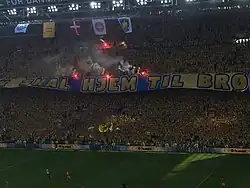 Brøndby is also renowned for its ultra fanscene. The most prominent group is Alpha. Founded in 2006, the group is placed in the centre of the Southside Stand and are the main organizers of songs, flags, banners and tifo.[54] Other prominent groups are Suburban Casuals, Southside United, Svinget, Deling 43 and Fri Sport.