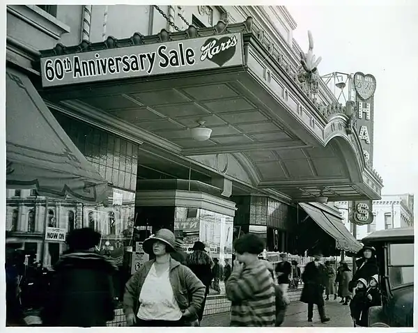 The Hart store was famous for its attentive customer service, and benefited from the deep loyalty of customers and employees alike. When the country found itself in the grip of the Great Depression, Hart's held on to its central place in the lives of San Jose's citizens, and continued to buy advertising in local publications.[7] The Hart family was one of the city's most prominent, and their influence was the source of many colorful stories: one such tale recounts that the artist who repainted the ceiling of the Cathedral Basilica of St. Joseph in the 1920s modeled the cherubs in his work on the family's children.