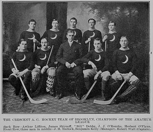The Brooklyn Crescents played in the American Amateur Hockey League in 1896–97 (the inaugural season) and between 1899 and 1918 and won nine championship titles, most in league history.[2] The Crescents had several Canadian players on its team, among them Bob Wall, Bill Dobby and Arthur Liffiton from Montreal, Jimmy Shirreff from Brockville and James Sarsfield Kennedy from Barrie. Wall, Dobby and Kennedy joined the Crescents from the rivaling Brooklyn SC before the 1899–1900 season,[3] while Liffiton joined from the same club for the 1901–02 season.[4] Before moving to New York City both Bob Wall and Bill Dobby had played on the Montreal Shamrocks.