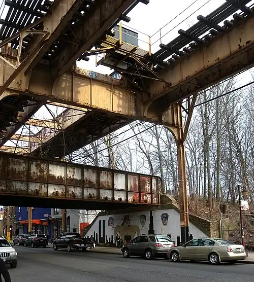 The elevated station was located on the south side of the overpass over Jamaica Avenue, with two side platforms and shelters on both platforms. The platforms at this station, like the others on the line, were constructed from wood.[5][6][7] While most of the other stations on the line south of here were rebuilt in the 1930s and 1940s with concrete platforms, the platforms at this station were not replaced.[8][9][10] The BMT Jamaica Line runs over the Rockaway Beach Branch tracks along Jamaica Avenue. This section of the Jamaica Line opened in 1917, built after the Long Island Rail Road (LIRR) station.[11] Connection was available to the Jamaica Avenue surface trolley,[11][12] and to the Jamaica Line two blocks east at the 102nd–104th Streets station.[13][14]