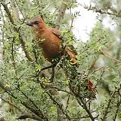 The brown cacholote is 24 to 26 cm (9.4 to 10 in) long and weighs 63 to 79 g (2.2 to 2.8 oz). It is one of the largest furnariids and with its prominent crest somewhat resembles a jay. The sexes have the same plumage. Adults of the nominate subspecies have a dark rufous face. Their forehead is dark reddish brown and their crown and crest darker brown with a streaked look. Their hindcrown is bright rufous, their "collar" and upper back duller rufous, the rest of their back even duller rufous, their rump bright rufous, and their uppertail coverts a darker rufous. Their wing coverts are dark rufous-brown with paler feather tips and their flight feathers dark fuscous brown with narrow pale brownish edges. Their tail is dark rufous; the feathers have few barbs on their ends. Their throat is bright cinnamon-rufous. Their breast and upper belly are darker with pale feather tips on the latter. Their lower belly, flanks, and undertail coverts are more rufescent with the same "frosty" pattern of pale feather tips. Their iris is yellow to buff-yellow, their maxilla black with a gray base, their mandible blackish with a light gray base, and their legs and feet grayish olive to dull greenish. Juveniles have a shorter crest than adults, with some mottling on the underparts and a greenish iris. Subspecies P. l. argentina is overall darker than the nominate, with the front of its crest more rufous.[5]