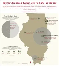 On February 9, 2015, Rauner signed an executive order blocking so called "fair share" union fees from state employee paychecks.[66][67] The same day, Rauner hired a legal team headed by former U.S. Attorney Dan Webb and his law firm Winston & Strawn to file a declaratory judgment action in Federal Court to affirm his action.[66][67] In February 2015, Rauner proposed $4.1 billion in budget cuts affecting higher education, Medicaid, state employee pensions, public transit, and local government support. In April, Rauner also suspended funding for programs addressing domestic violence, homeless youth, autism, and immigrant integration. Critics called these moves "morally reprehensible" and harmful to the state economy.[68][69][70][71]